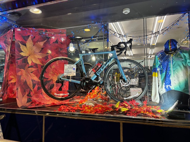 燃える紅葉(モミジ)、イタリアコルナゴ社の美しいロードバイク展示中!只今全フロアー、秋こそ自転車セール開催中です。